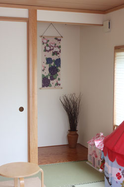 床の間アート畳の部屋といえば、床の間。 しっくりきます。 何もそこに、墨絵の掛軸を飾る、 という決まりはありません。 こんな藍染のタペストリーを掛軸風に飾るのもオシャレです。 ちなみにこの床の間の床は松 奈良 、 床柱は天然シボリ丸太杉 栃木 、 上の幕板。