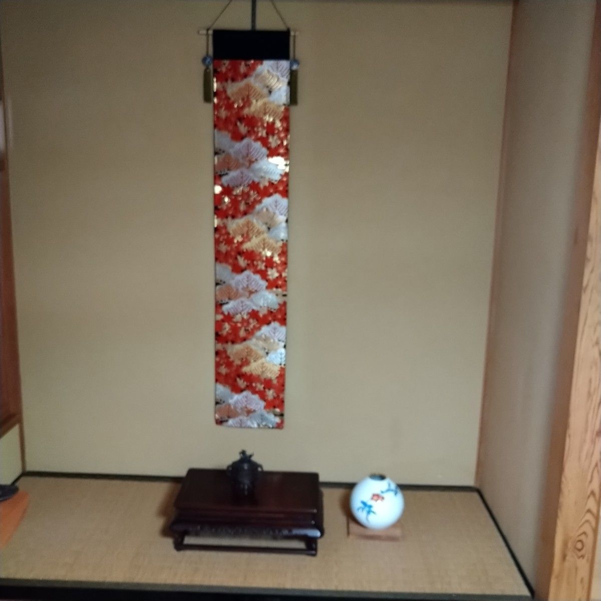 床の間の掛け軸を外してからは、 タペストリーで季節感を楽しんでいます。 以前、和裁士のまりさんに反物で帯とタペストリーを作っていただきました。今!この空間がお気に入りです💕。