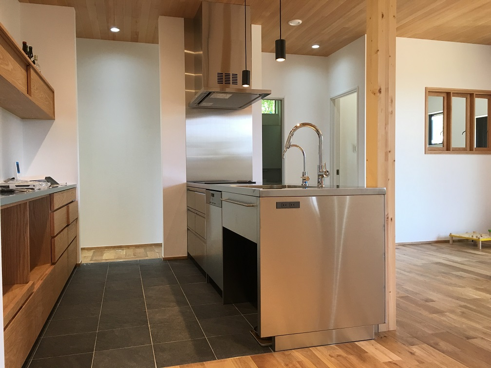 シックな木目調とステンレスの調和が美しいシンプルな対面キッチン - 事例写真「心地の良い木の香りがする無垢剤の家」注文住宅のハウスネットギャラリ。