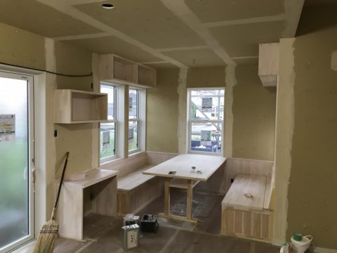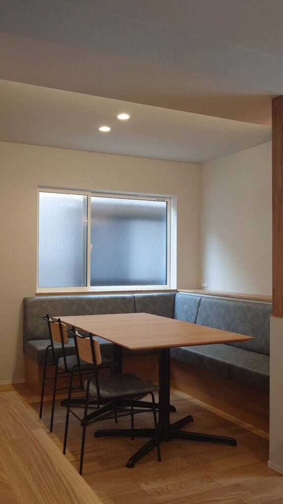 太陽の提案住宅🏠窓際のヌック風ダイニングスペースダイニングダイニングスペースヌックヌックスペース窓際窓際インテリアダイニングテーブルダイニングチェアダイニングインテリアベンチガルカフェ風インテリア注文住宅提案住宅建売住宅。