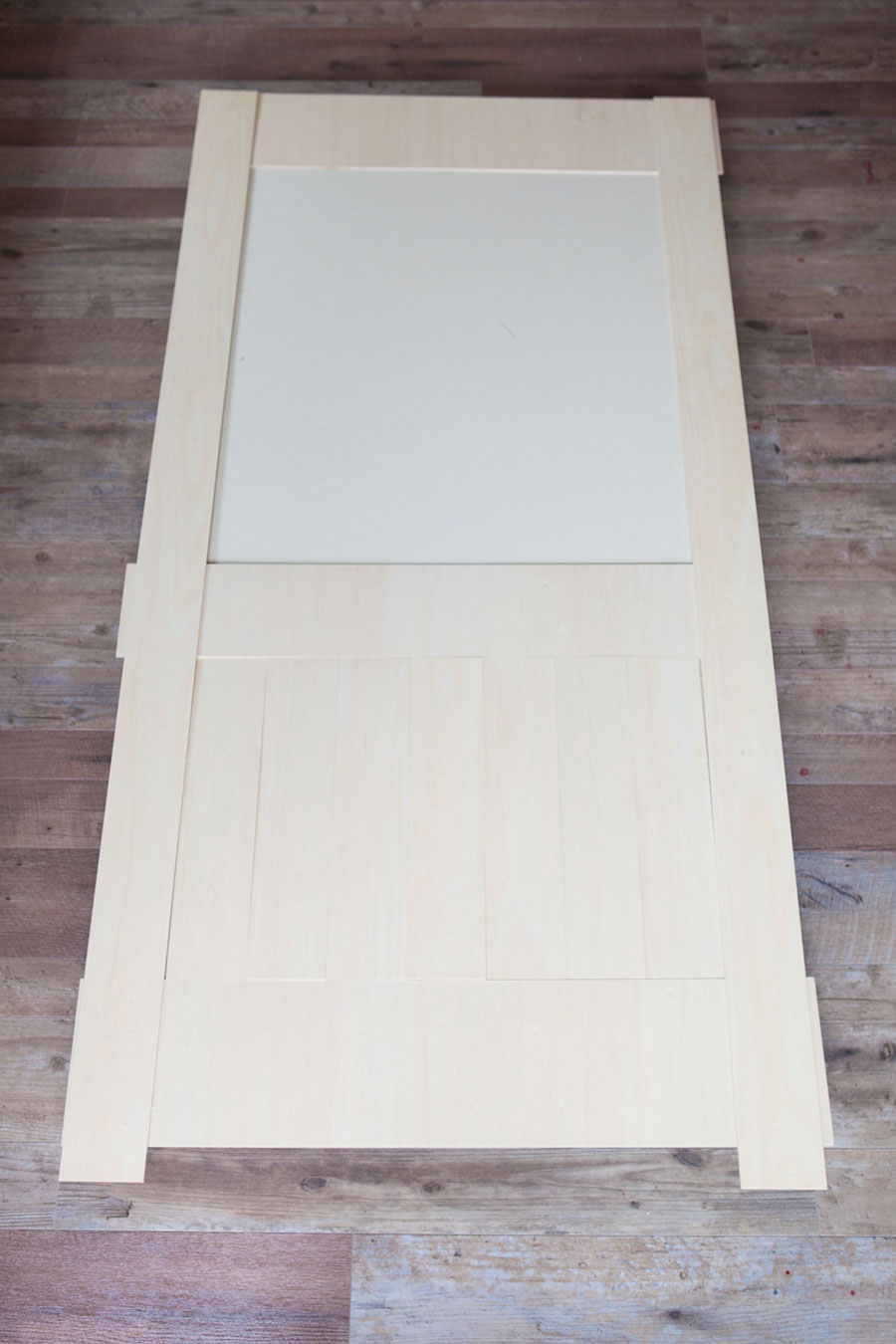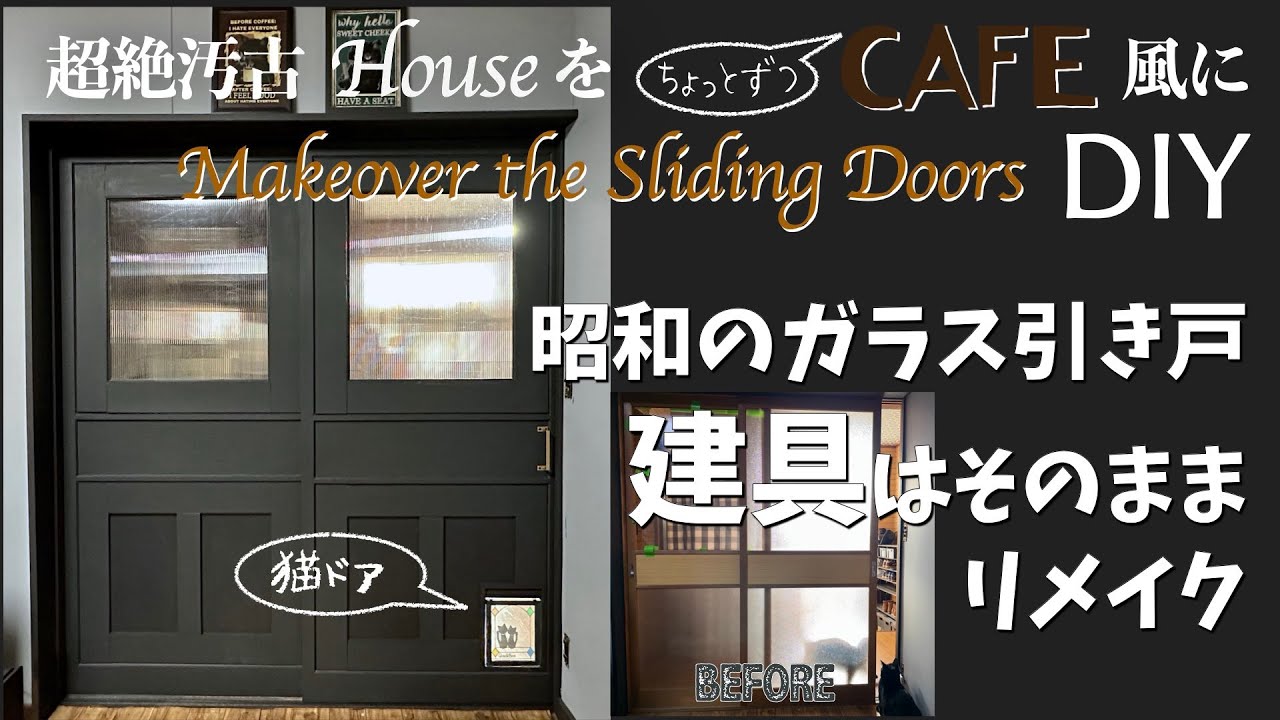 古いガラス引き戸を格安洋風リメイク 建具はそのまま端材を貼るだけ!猫ドア付きでカッコよく。