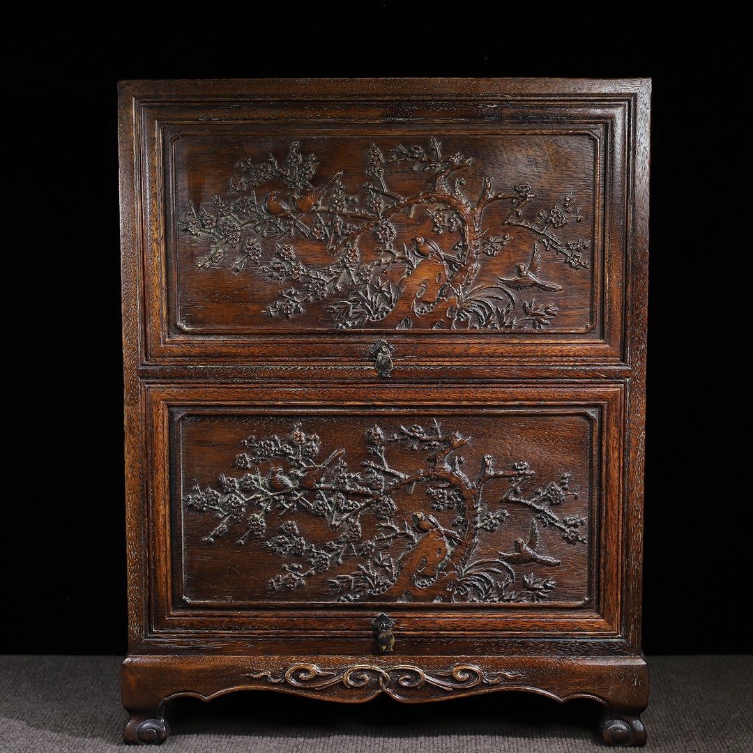 旧蔵 清 花梨木 彫刻 カササギ登梅 画箱 収納棚 木製 極細工。