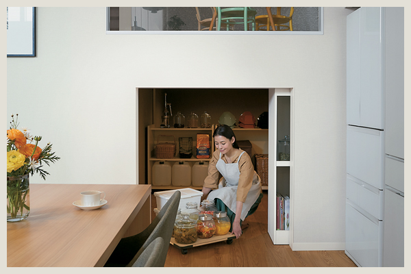 大収納空間「蔵」って実際使いやすい? 「蔵」の上手な使い方とは? せっかく蔵があっても奥から順番に思い出の品を置いておくのではどんどん手がつけられない状態に。かしこい「蔵」の動線の作り方とそれを補助するミサワホームの家具を紹介します。
