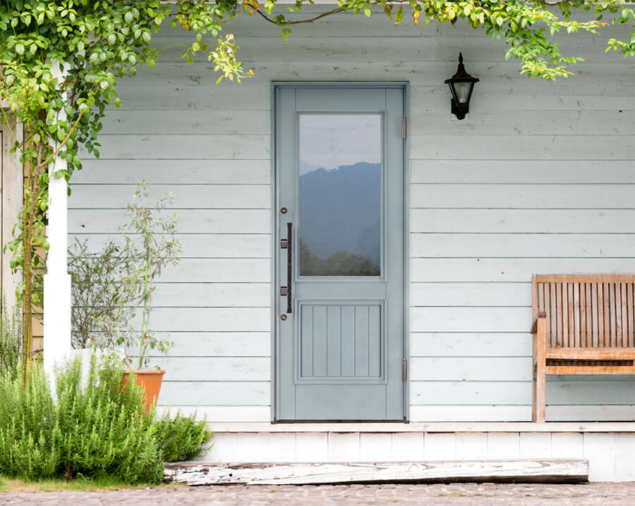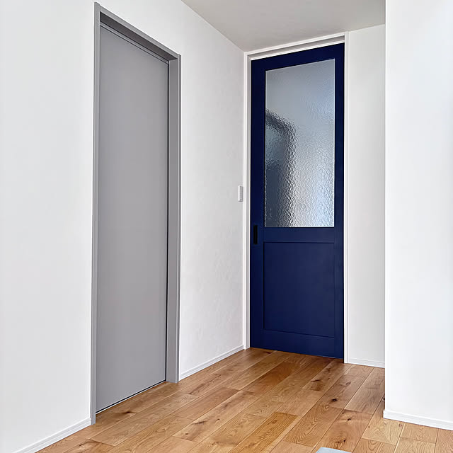 かわいい室内ドア ニュアンスカラーのグレーや淡いブルーがおしゃれな木製ドア。