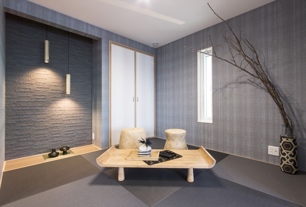 重厚感のある濃いグレーの壁紙とシックな床マットが調和する、落ち着いた和モダンの和室 -事例写真「モラージュ菖蒲モデルハウス×埼玉県」注文住宅のハウスネットギャラリ。