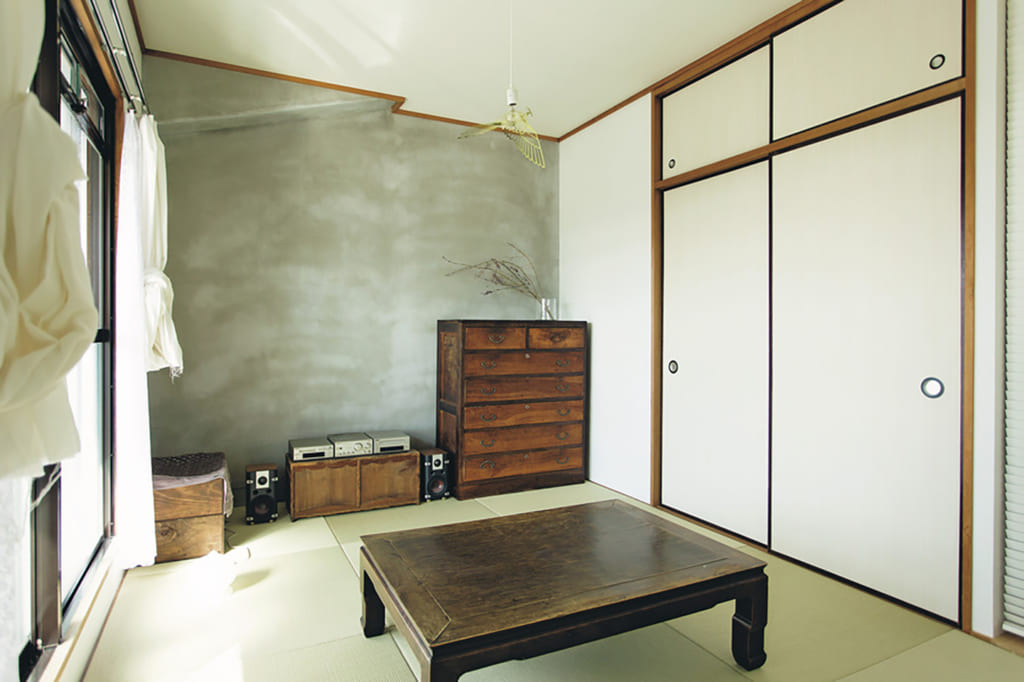 和室は客間にも、子育てが始まればお昼寝スペースにも使える便利な場所。グレーのアクセントクロスを配したことで、和モダンな印象に仕上がった くふ。
