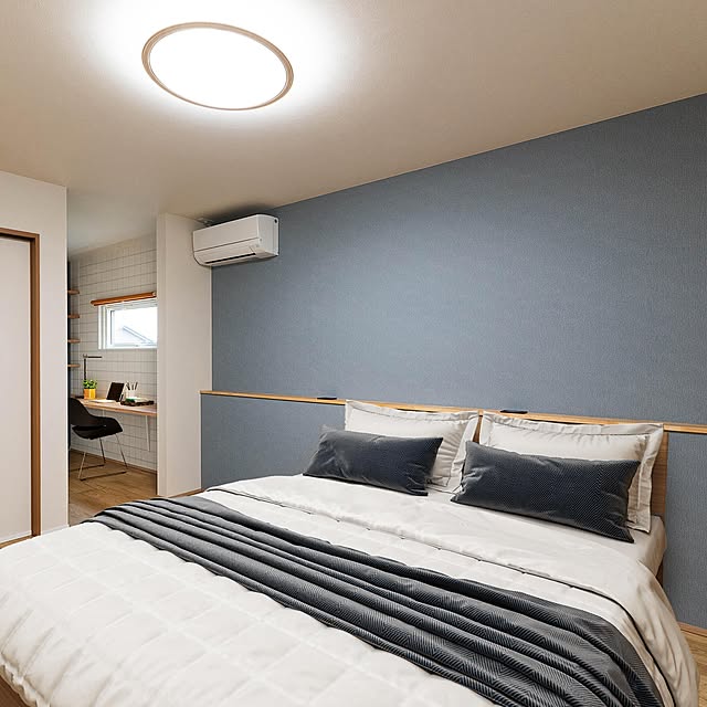 落ち着いたブルーのアクセントクロスと温かみのある照明が心地よい寝室 -事例写真「遊び道具もたっぷり収納、間接照明の柔らかな光が心地よい北欧モダンハウス 」注文住宅のハウスネットギャラリ。