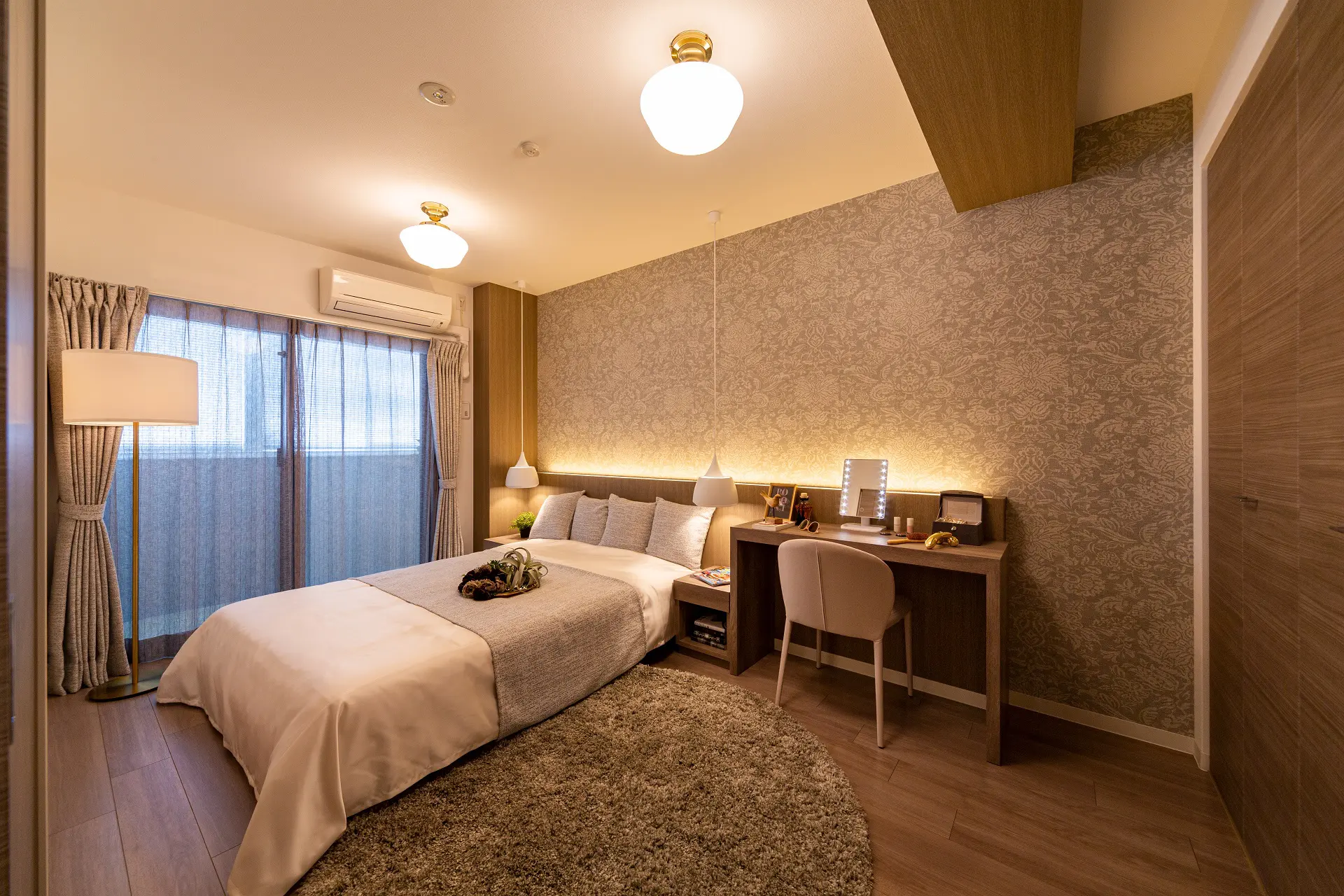 ホテルライクで心地いい寝室で贅沢な時間を楽しむ壁紙や照明にもこだわる新築ベッドルーム実例東京・神奈川・愛知の注文住宅ならアクティエ。