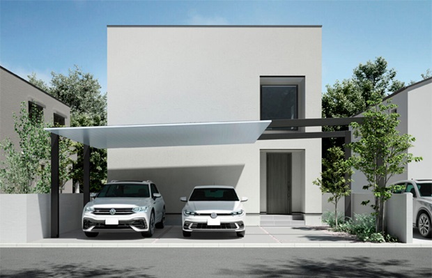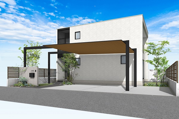 梁延長のフォルムが門回りを一体化させるスタイリッシュなカーポートエクスプラット - エクステリア&ガーデンデザイン・プラン検索サイトRIKCADデータ無料配信。