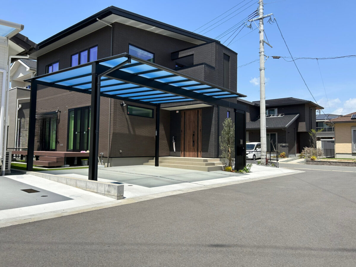 千葉県佐倉市 梁延長カーポートで使いやすく。モノトーンでまとめたモダンなエクステリアエクステリア 外構の専門店千葉のガーデンファクトリー ホコ。