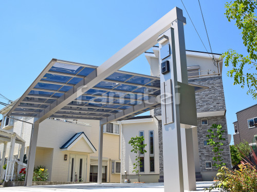 梁延長タイプカーポート施工例 カーポートと門柱が一体となったシンプルエクステリア。
