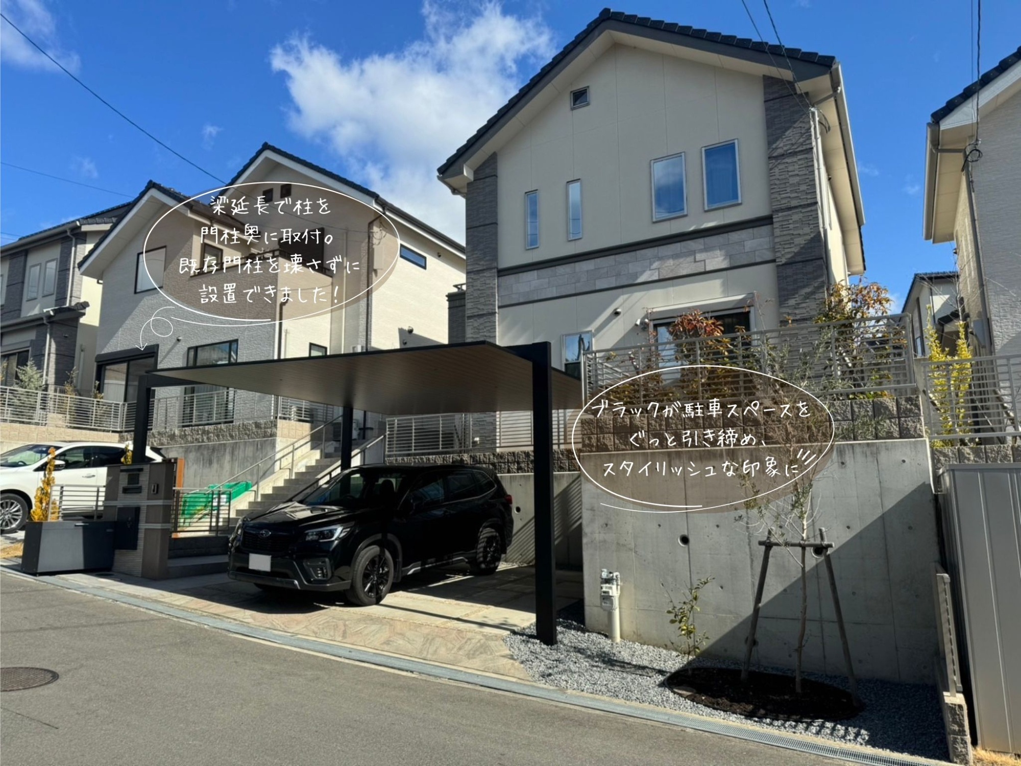 梁延長のカーポートでスタイリッシュなエントランスに 大津市京阪グリーン滋賀・京都・大阪のエクステリア・ガーデン・外構工事。