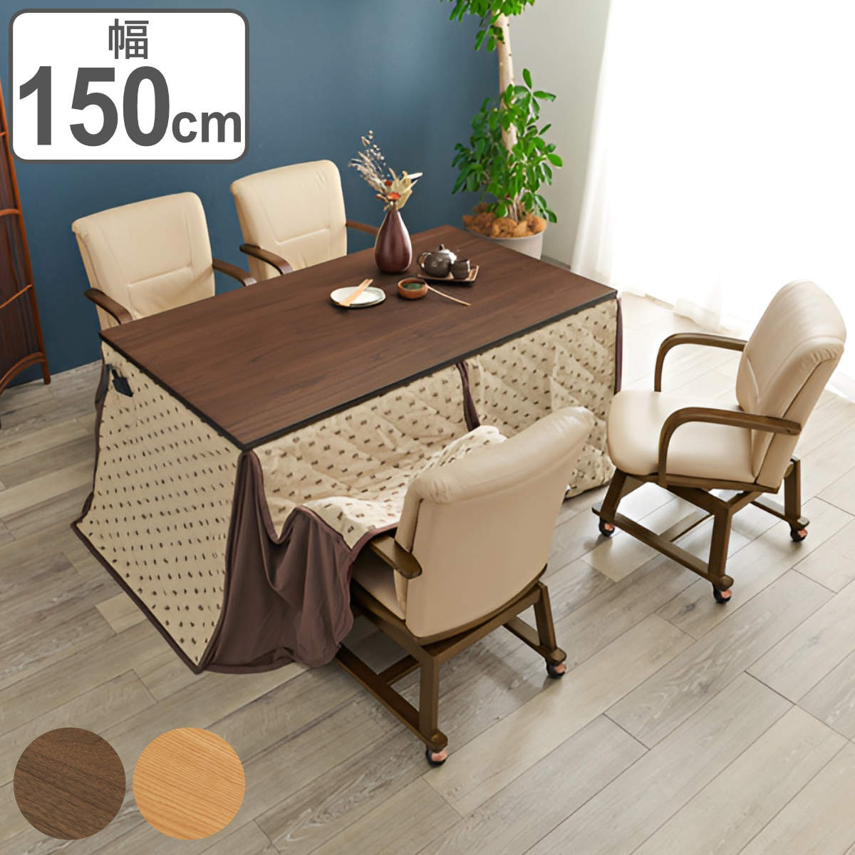 こたつ6点セット テーブル 幅150cm 布団 チェア4脚 キャスター付き ハイタイプ おしゃれ 長方形コタツ ダイニングセット 4人掛けダイニング こたつ 高さ調節 継ぎ脚 こたつ布団 回転 椅子 ダイニングチェア 1年中 使えるブラウンブラウン : リビングート。