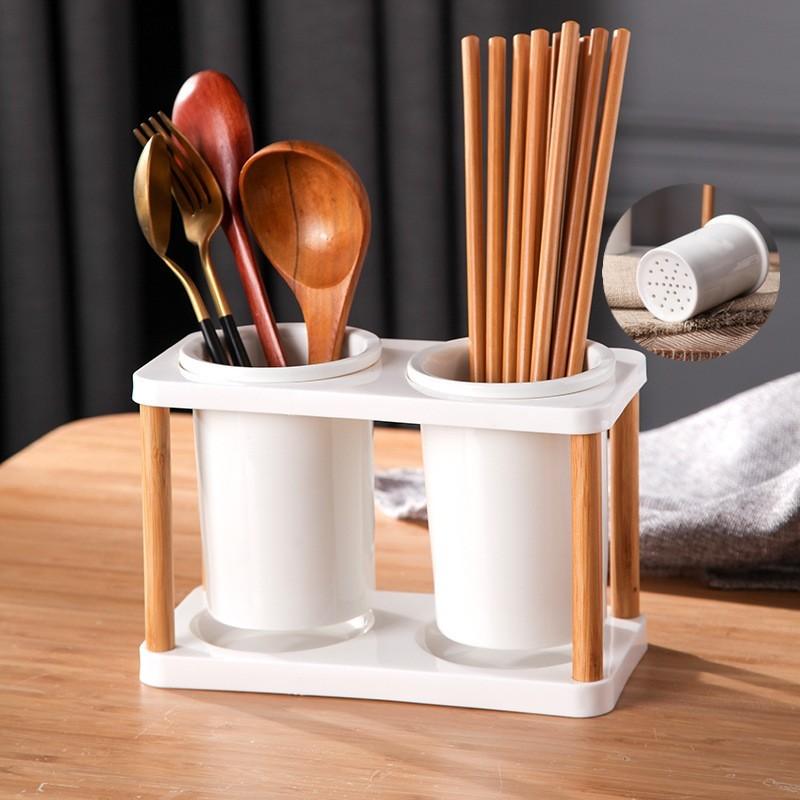 Amazonキッチンツールスタンド 水抜き穴付き箸立て 2個一体型 セラミック製 木製スタンド カトラリーホルダー 水切り 通気性よい 箸ホルダーシンプル 丈夫 ナチュラル 安定感 多機能 箸スタンド スプーン フォーク収納ホワイト 箸立て オンライン通販。