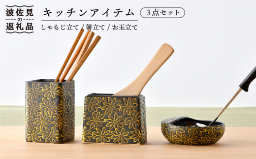 波佐見焼 キッチンアイテム しゃもじ・お玉・お箸立て 3点セット 黒 食器 皿長十郎窯AE23マイナビふるさと納税。