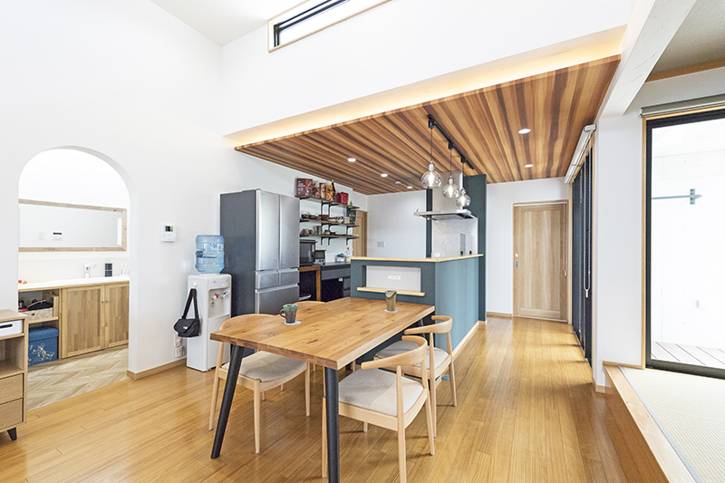 奥さまこだわりのカウンターキッチンはカフェをイメージ。グレーの折下げ天井もおしゃれ くふうイエタテ。