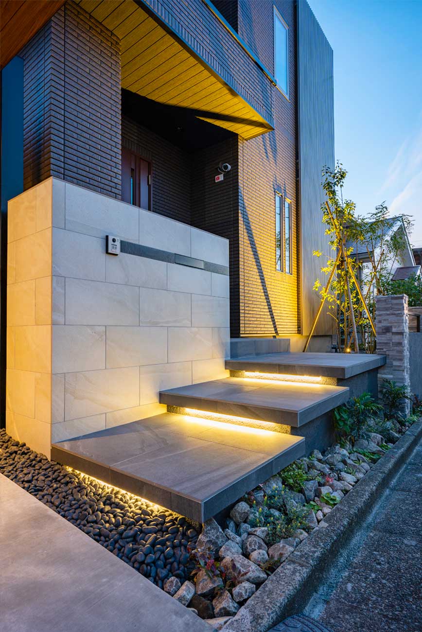 間接照明階段 浮き階段 アプローチ タイル張り リクシル タカショー エントランス 玄関 土間 土間コンクリート 土間 コンクリート洗い出し 洗い出し カーポード 照明 照明計画 駐車場 外構デザイン 外構プラン 外構 エクステリア ガーデン ガーデニング 庭 岐阜外構 新築。