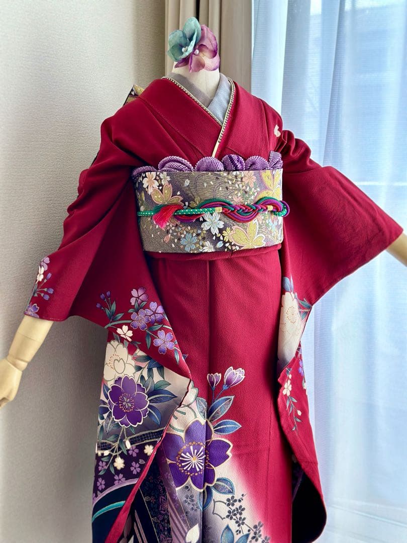 赤色 花柄 振袖 着物 キャラクターグッズ。