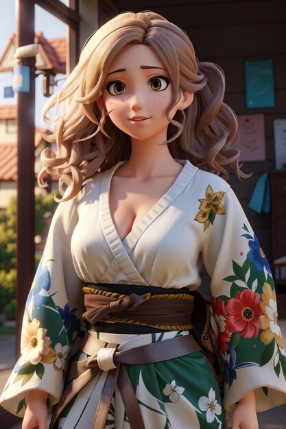 着物を着た女性 花柄アニメーション キャラクターPremium AI生成画像。