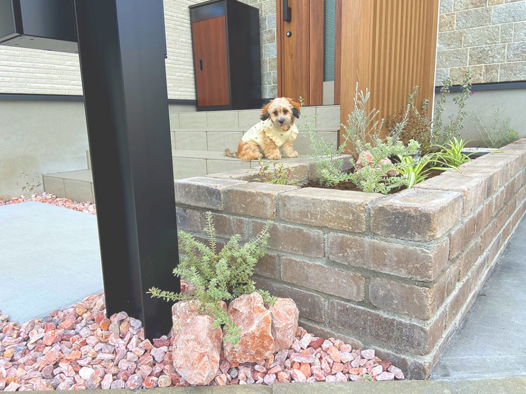 施工例:守山市 外構工事 玄関まわり アプローチ ポーチ 門柱 表札 ポスト 駐車場ガレージ床 土間コンクリート 錆砂利目地 犬走り 防犯砂利敷き 錆 砂利 防草シート加工 グリーンフィールド ザバーン。