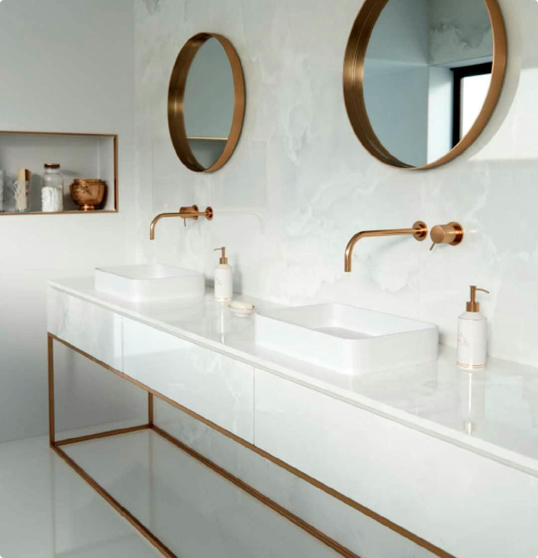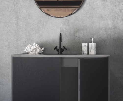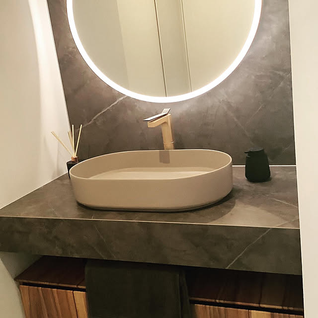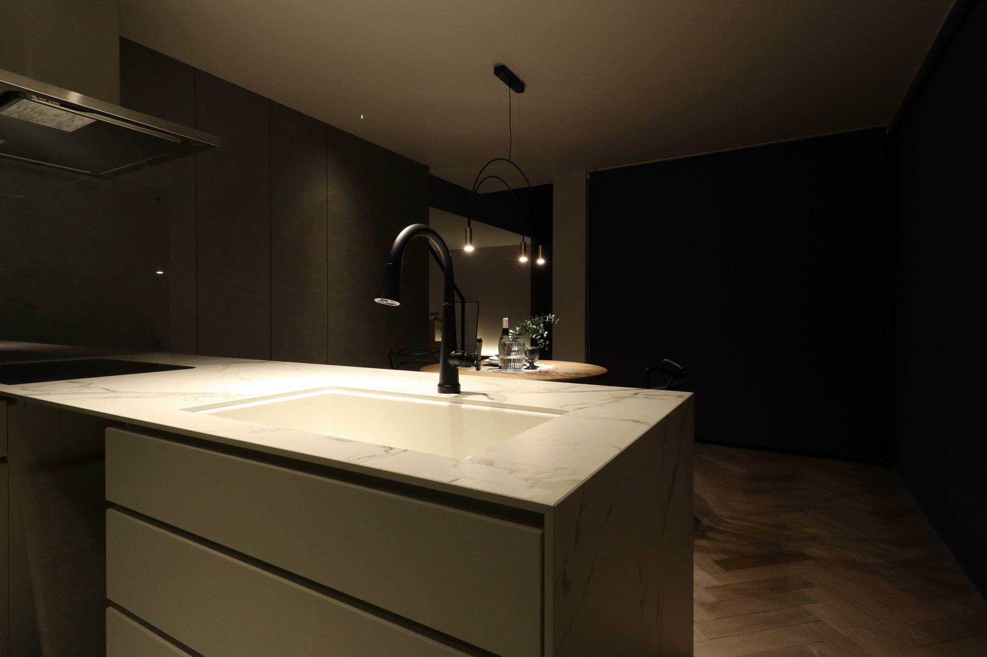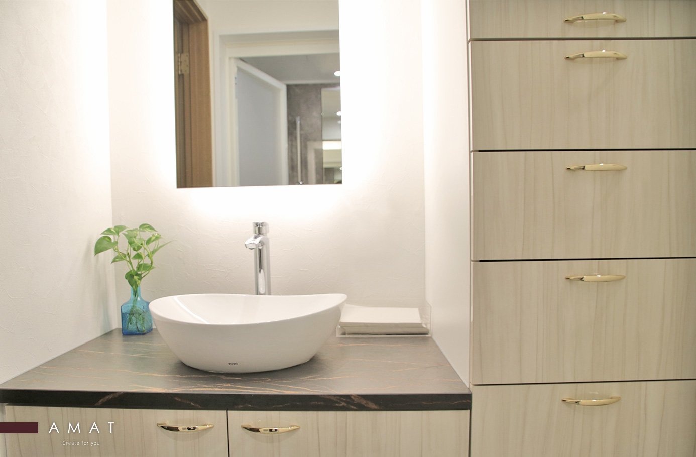 Dekton「Marmorioマルモリオ」をワークトップに使った、シンプルを極めたドレッサー。軽やかですっきりミニマルなパウダールームは、リビングから見えることを想定して、どの角度からも美しく見えるデザインです。ホテルライクなドレッサーを、あなたの邸宅に。 カラー。