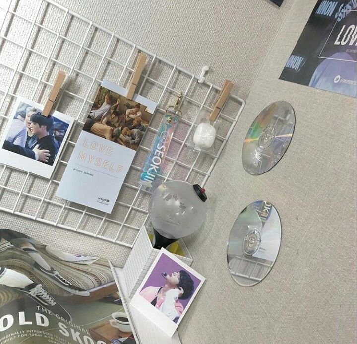 ❁ 収納術の天才!?グッズがたくさんあるのに綺麗でオシャレなオタクのお部屋をご紹介! ワイヤーラックを使って、うちわを引っ掛けたり、韓国オタクの子はスローガンをポーチに入れて引っ掛けたりしてるみたい✨ 画像を参考。