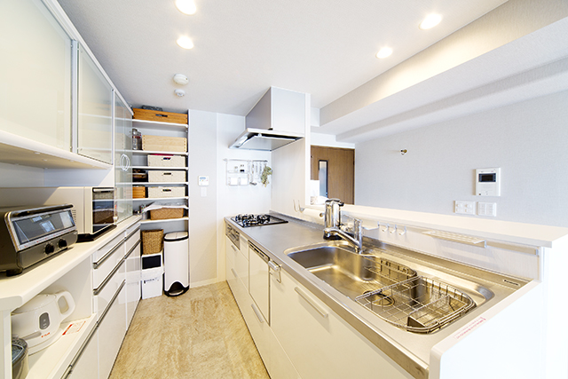 M05 キッチン前の立ち上がりカウンターを収納スペースとして使う ≫ スマイラボsumai LAB。