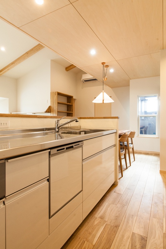 収納を兼ねた立ち上がりカウンターで手元を隠すキッチン 平屋のような2階建て 33坪の実用サイズ重量木骨の家。