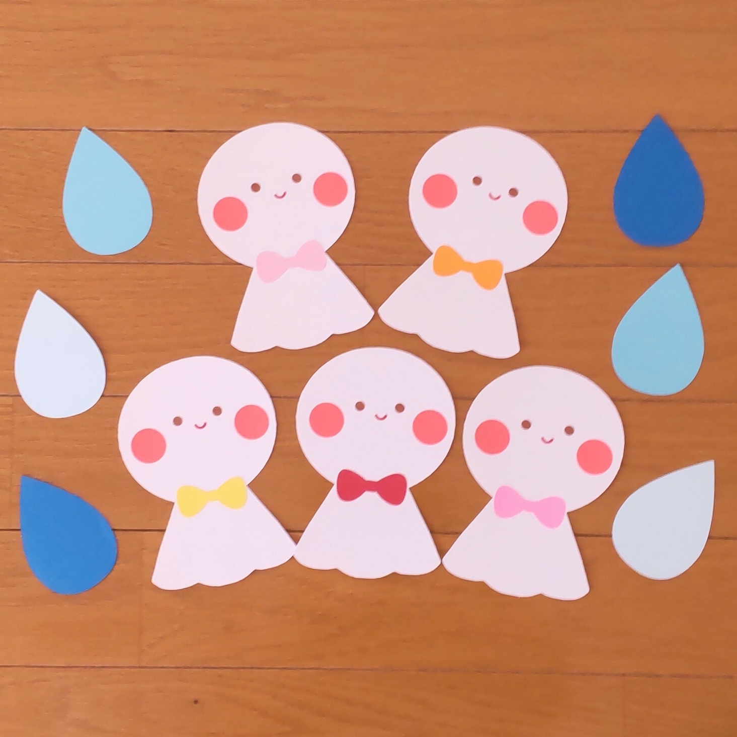 無料ダウンロード型紙で「てるてる坊主」の壁面飾りを作ってみた! 梅雨 春 夏 6月 7月 雨 保育園 幼稚園 介護施設 デイサービス 壁面装飾 製作壁面飾り型紙工房。