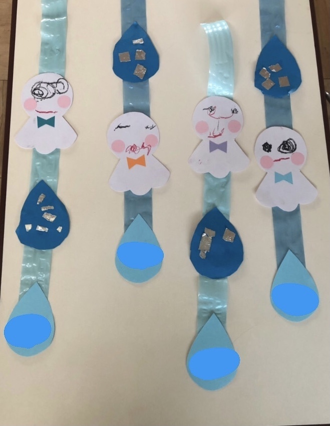 6月壁面 保育室飾りつけ『てるてる坊主と雨つぶ』雨は障子紙にスポイトで青の色をポタポタと垂らして模様をつけていきました。泡も一緒に出る時があり、それをまたつついてパチンっと割れるのも楽しかったみたいです! ※コップが倒れないように、ティッシュの箱に。