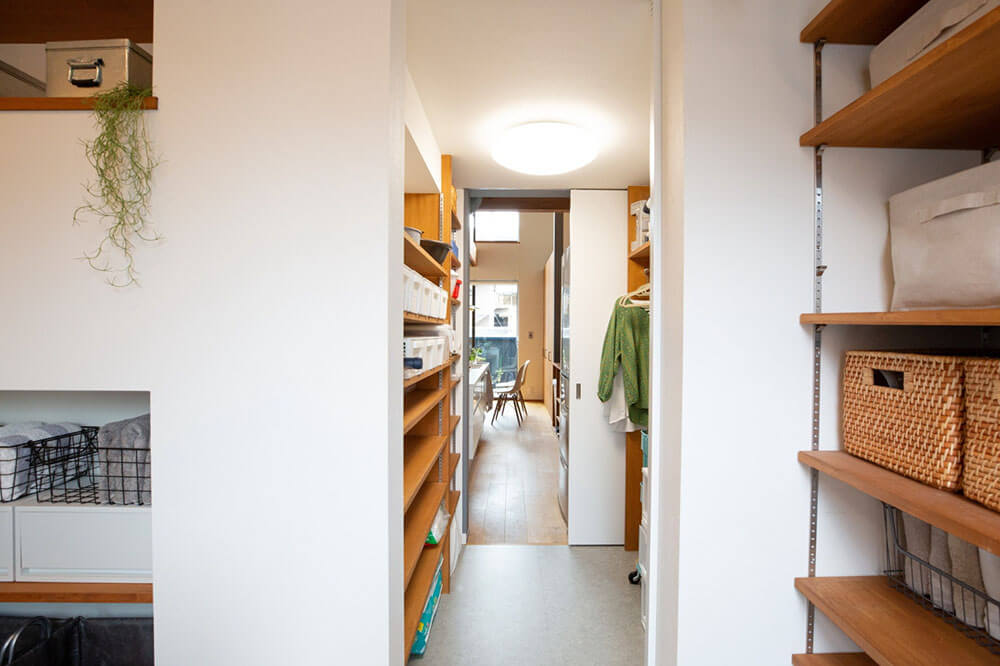 廊下とキッチンをつなぐウォークスルーパントリーには、生活雑貨をまとめて収納 くふうイエタテ。