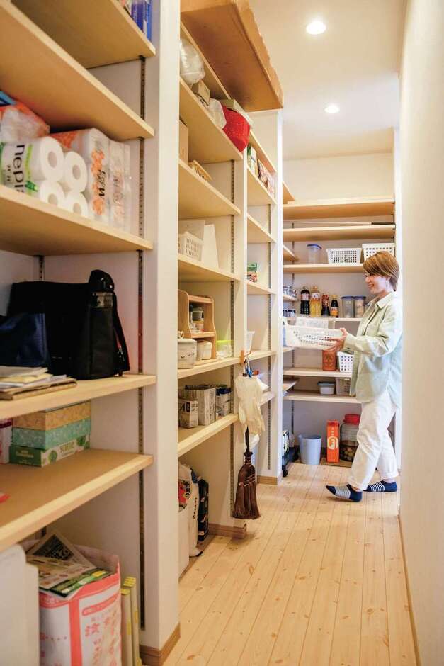 収納しやすく探しやすいパントリー。可変式の棚なのでデッドスペースが生まれない くふうイエタテ。