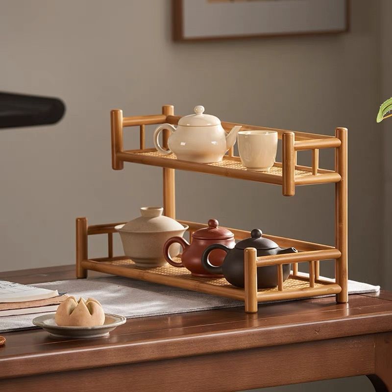 カップホルダー ディスプレイ棚 2層 竹製 茶杯 ティーポット 収納ラック 縦型収納ラック。