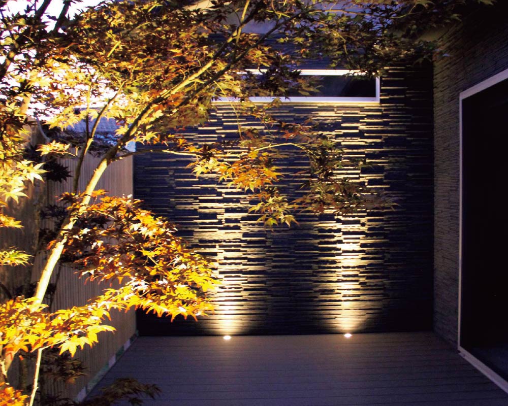 植栽と門袖をライトアップ。玄関まわりを明るくして家族や来訪者にもやさしい光にタカショー空間実例紹介。