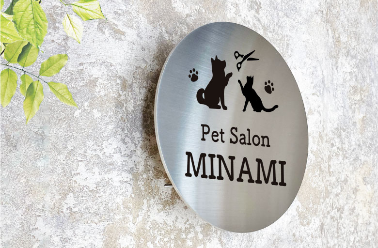 ステンレスプレート ボルト出し H300×W300×t3mm ヘアーラインサロンの看板 カフェの看板 整骨院の看板 クリニックの看板 屋外 おしゃれ可愛い看板 丸型の看板ステンレスサイン ステンレスの看板 SC33-B。