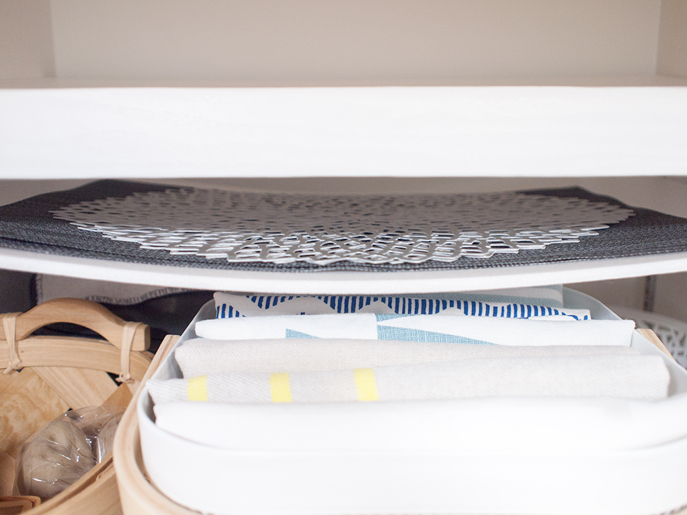 ランチョンマットの収納見直し。100均ダイソーつっぱり棒で棚作りウチブログ。