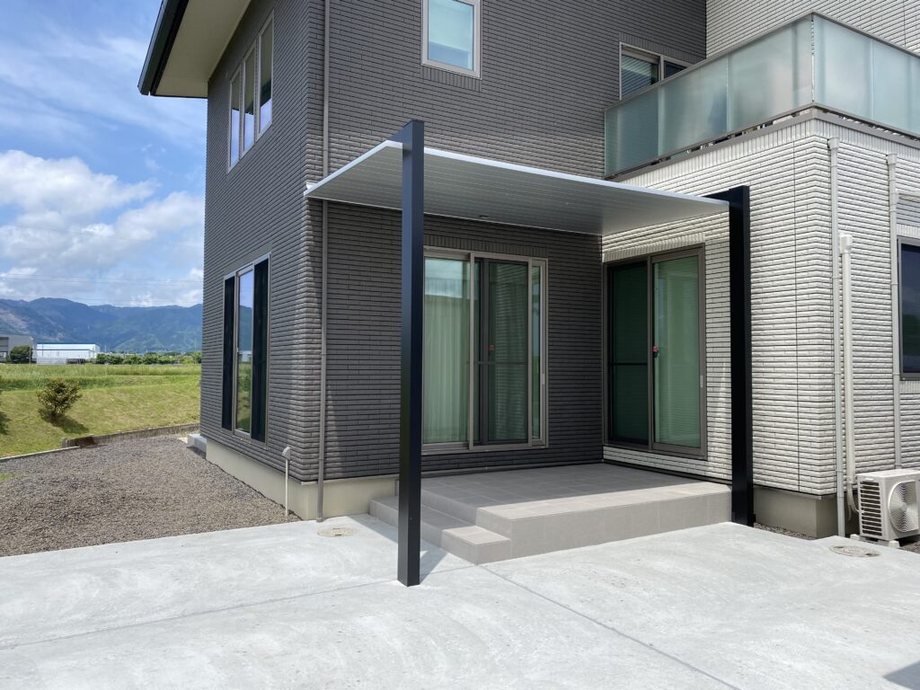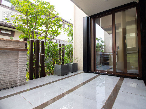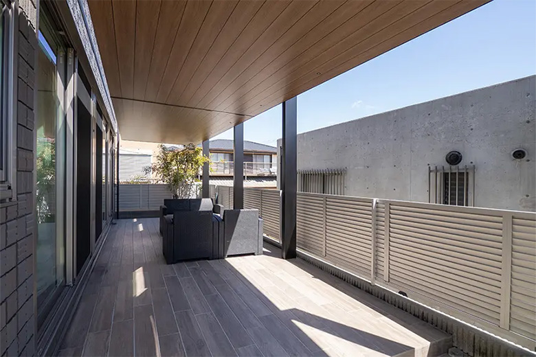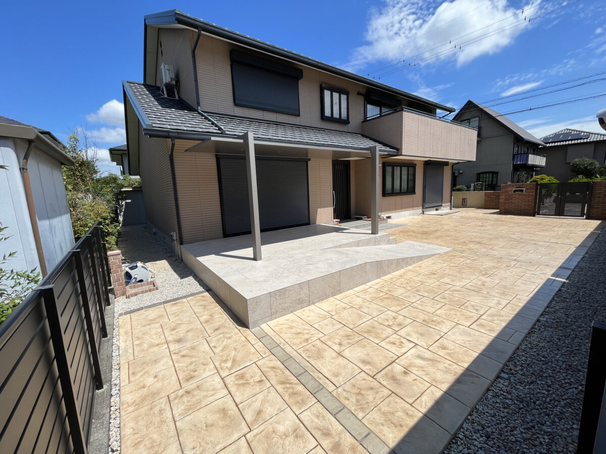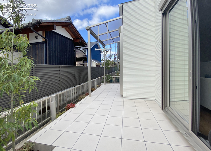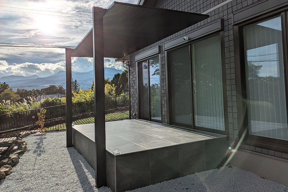 高級感のあるテラス屋根、大判タイルでのタイルデッキ施工事例 - 株式会社メイク・プラスター三重県鈴鹿のスタンプコンクリート職人。