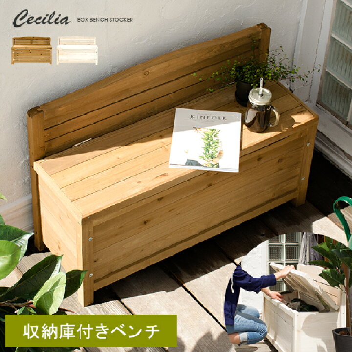全品5%OFFクーポン配布中ベンチ 木製 屋外 収納 ガーデンベンチ 収納付 ボックスベンチ 収納ベンチ イス 椅子 ベランダ テラス 庭おしゃれ 白 ホワイト 腰掛 90cm幅 コンパクト 物置き 薄型 天然木ボックスベンチストッカー Cecilia セシリア- 通販家具と。