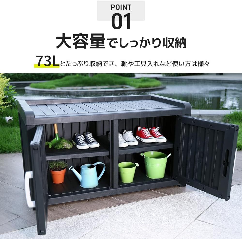 ベンチストッカー 収納ベンチ 樹脂製 幅81×奥行42.5×高さ45.4cm 座面耐荷重250kg 物置 屋外収納 ボックス 防水 耐候ベランダ ガーデン 庭 ベランダ 収納 大容量 おしゃれブラック, 容量73Lベンチストッカー 物置 屋外収納 192L 幅140cm アルミサビにくい ふた付 庭。
