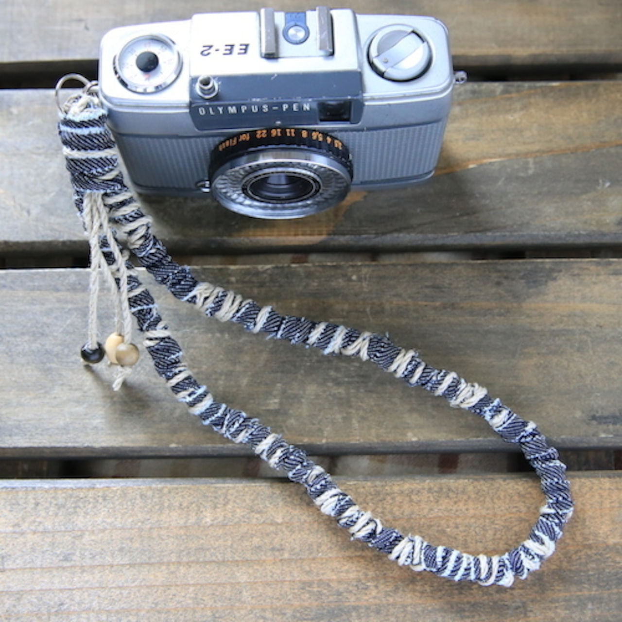 デニム裂き布ハンドストラップ手作り麻紐ヘンプカメラストラップ*nio。