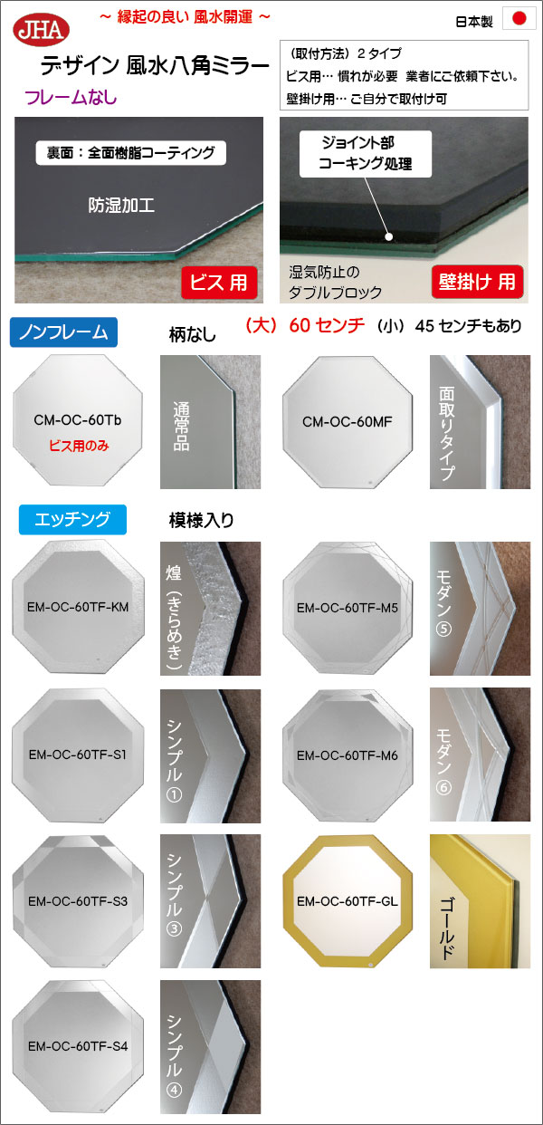 クーポンあり JHA 鏡 壁掛け おしゃれ 八角鏡 八角ミラー 壁掛け鏡 ウォール デザイン風水ミラーモダン6 飛散防止・壁掛け用 正八角形W600×H600 EM-OC-60TF-M6 風水鏡 フレームレスミラー ノンフレーム 化粧鏡 玄関 洗面 トイレ 寝室 モダン シンプルエッチング。