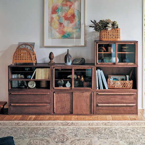古民家インテリアにオススメ! 昭和インテリア雑貨 重厚な木製飾り台 懐かしさを感じる、古材とガラスの組み合わせ お気に入りの雑貨や植物、食器を飾りながら収納できる、“見せる収納”にぴったりなガラス扉の収納アイテム。透明 な扉が視線を遮らず、圧迫感を和らげて。