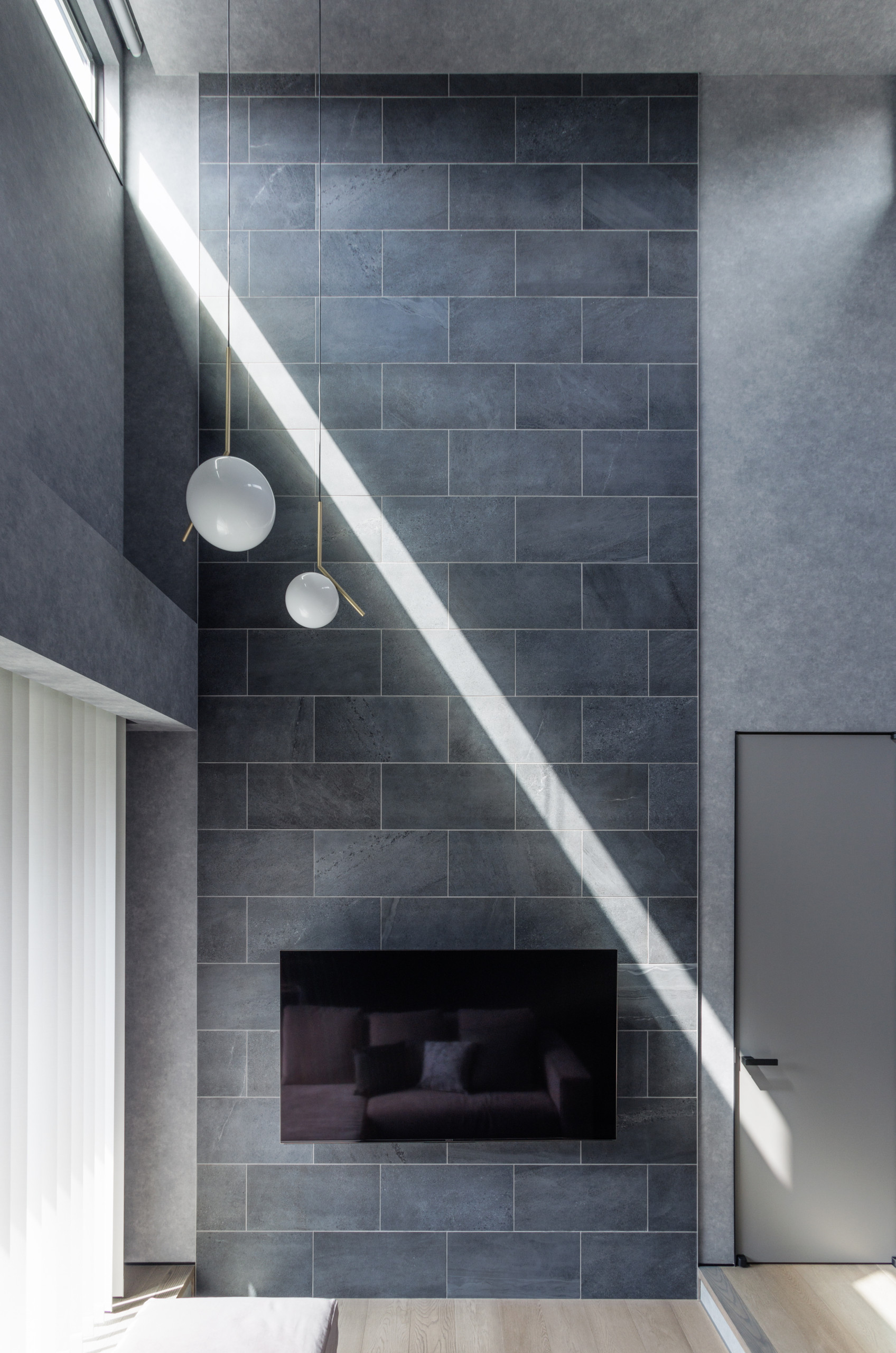 グレーのおしゃれなリビングセラミックタイルの床のインテリア画像 75選 - 2025 年 10月Houzzハウズ。