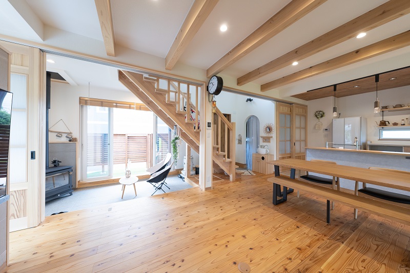 リビング続きの広い土間がある家無垢材の家づくり森のめぐみ工房。