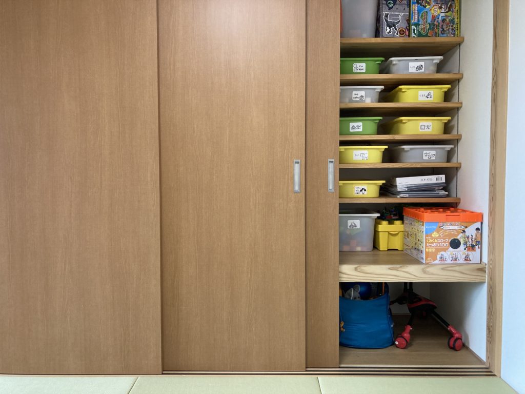 将来はお仏壇スペース。でも今はおもちゃ収納いつか、お仏壇を置くときのために作った0.5畳のスペース。そのときまで使わずに開けておくのはもったいないので、可動棚を付けておもちゃ収納として利用しています。 棚板が6枚あるので、なかなか大容量!和室はリビング。