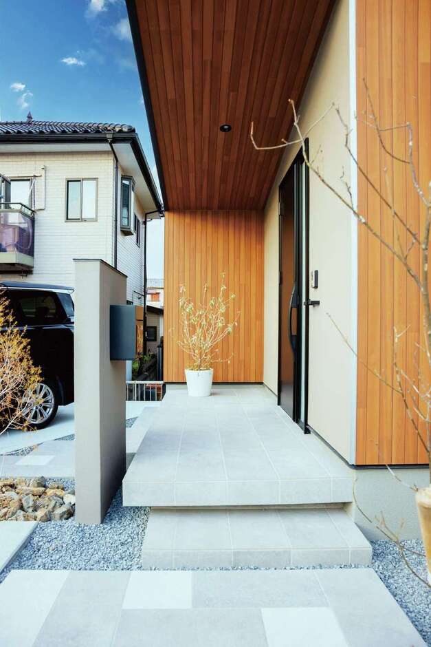 ポーチの軒天に神島のアルテザートを採用。外壁にも同じく木目調のサイディングを使用し、繋がりのあるデザインとした。 くふうイエタテ。