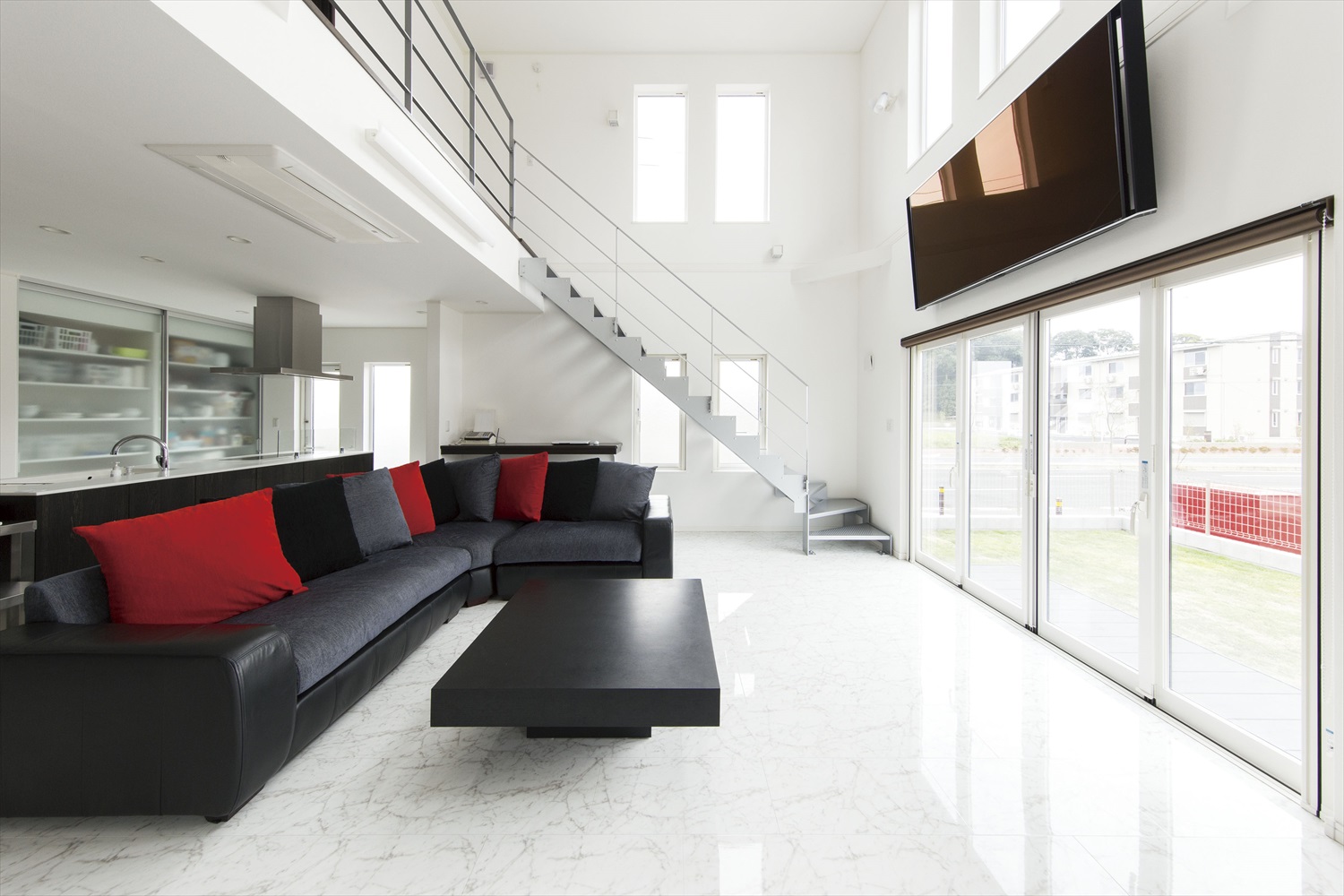 清潔感のある白を基調にした内装に、ポイントになるカラーのキッチンと建具 在宅ワークもできて、家族が気兼ねなく過ごせる家-リビングダイニング事例SUVACO スバコ。
