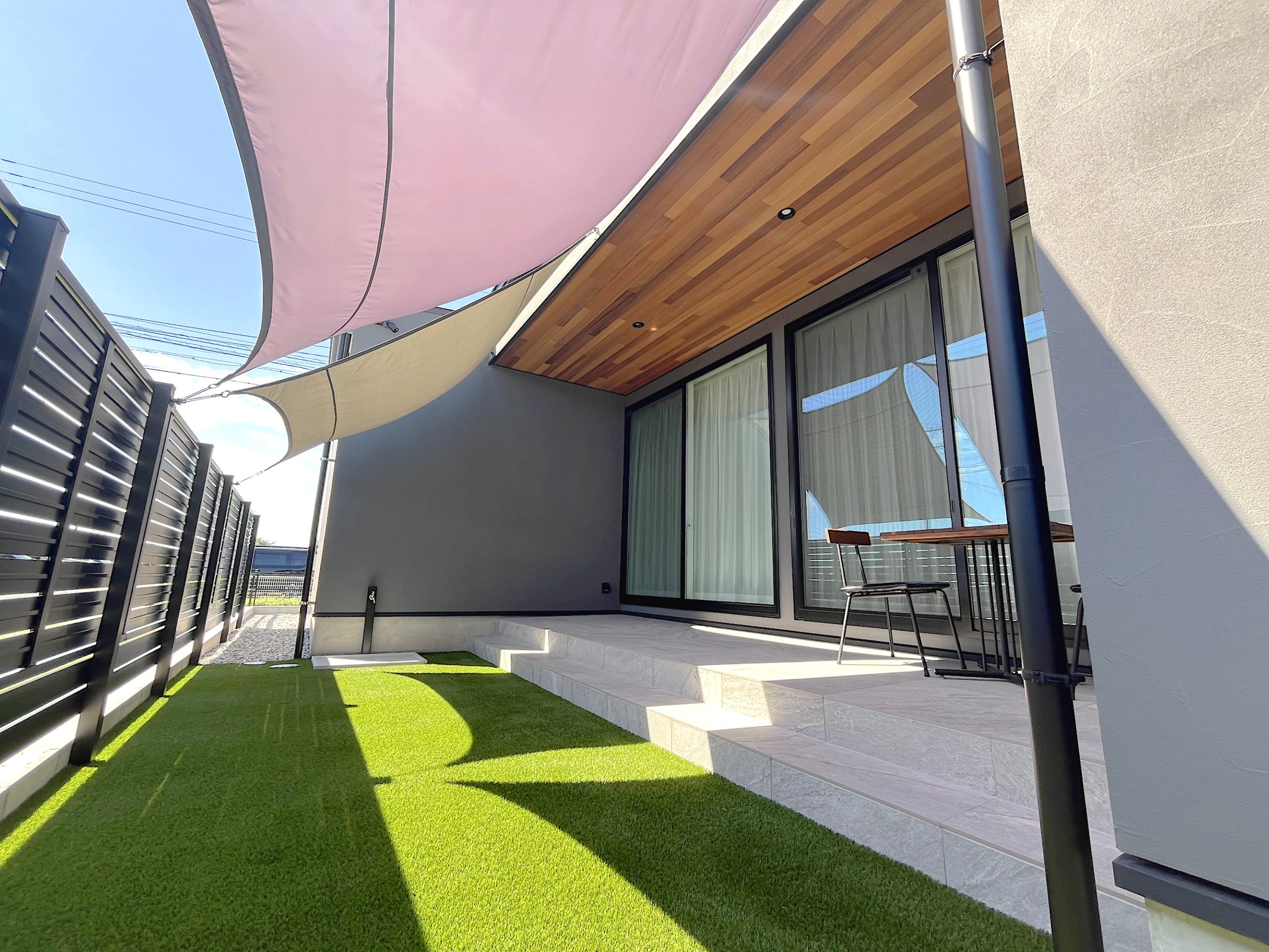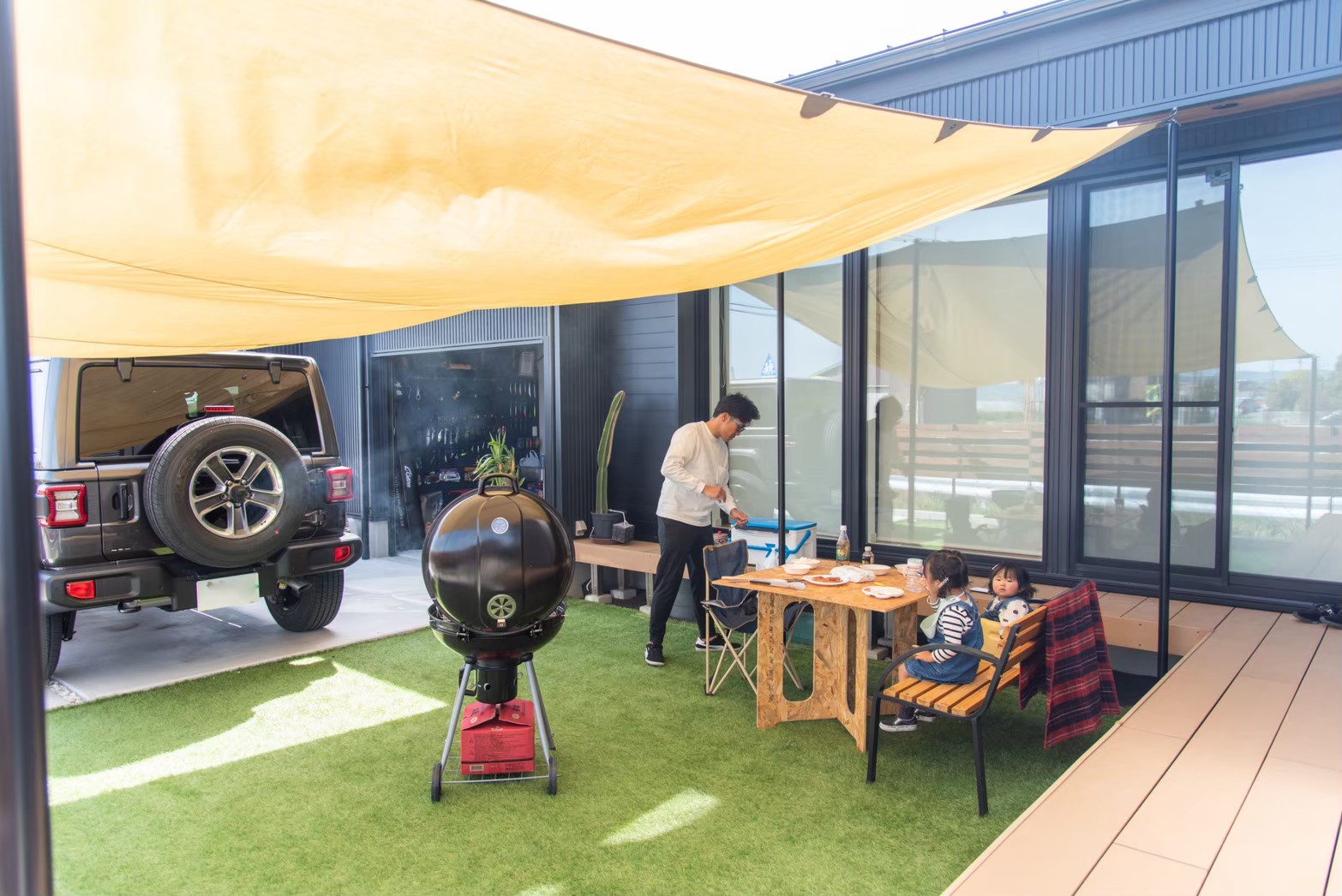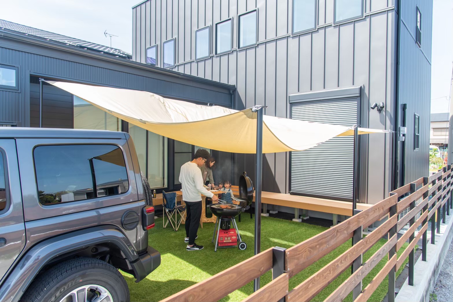 光も影も自由自在 テラスとタープの組み合わせ住宅デザイン。
