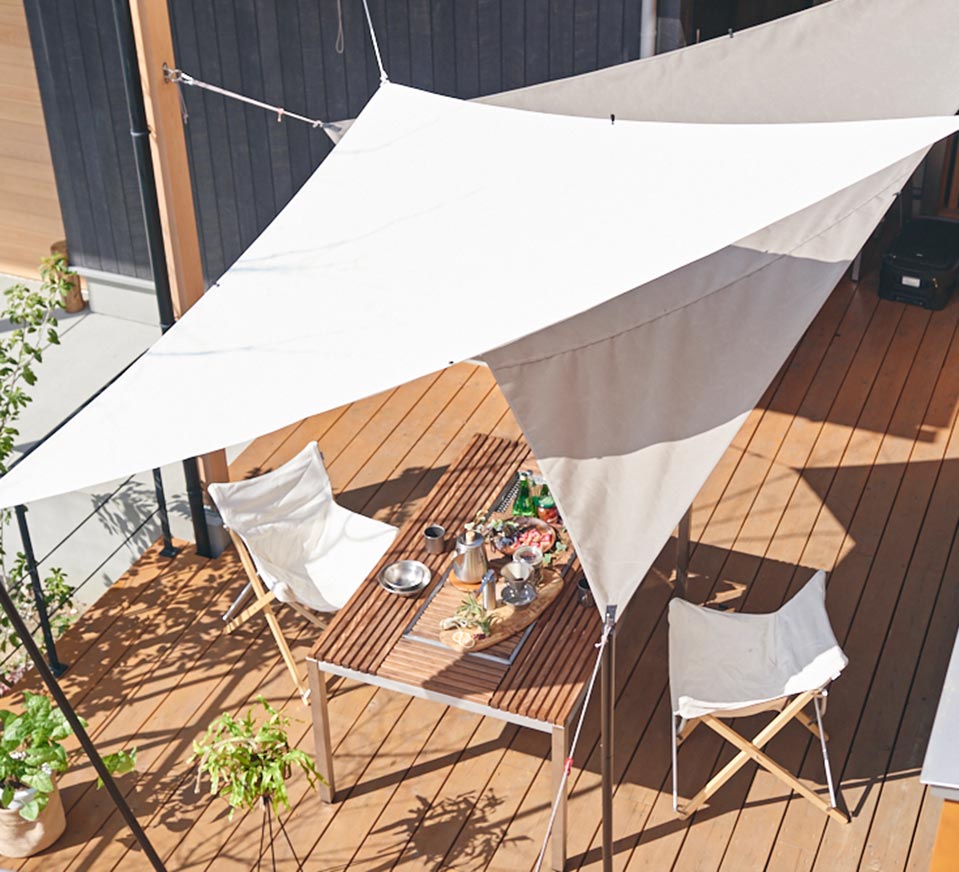 バリエーションと空間の広がり 頭上に2枚のタープを組み合わせて張ったテラスの屋外ダイニング。