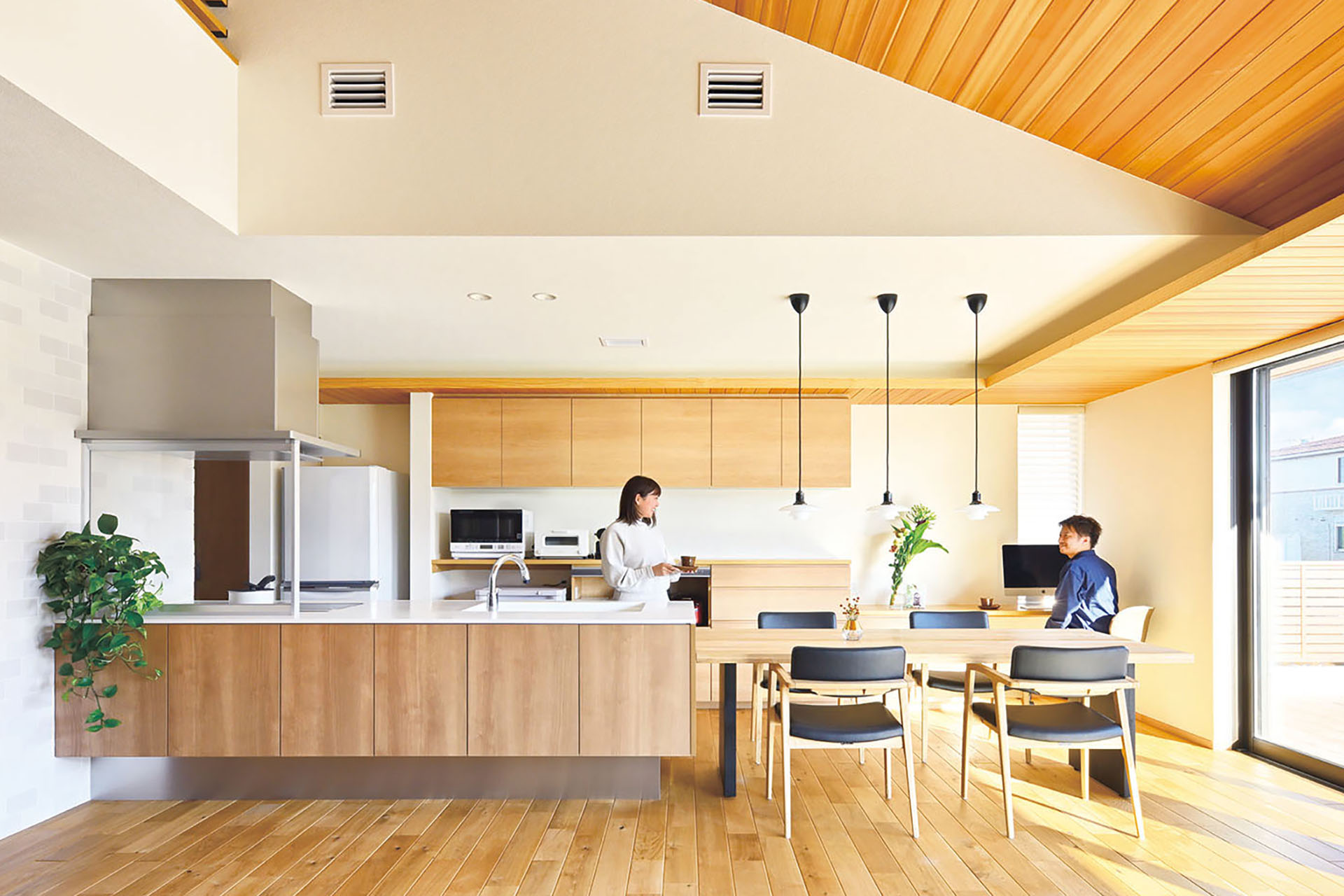 リビング部分は家全体の日当たりを考えて、平屋建てで計画。この平屋建てを活かした勾配天井は、木を仕上げ材として使用することで、落ち着いた空間に。